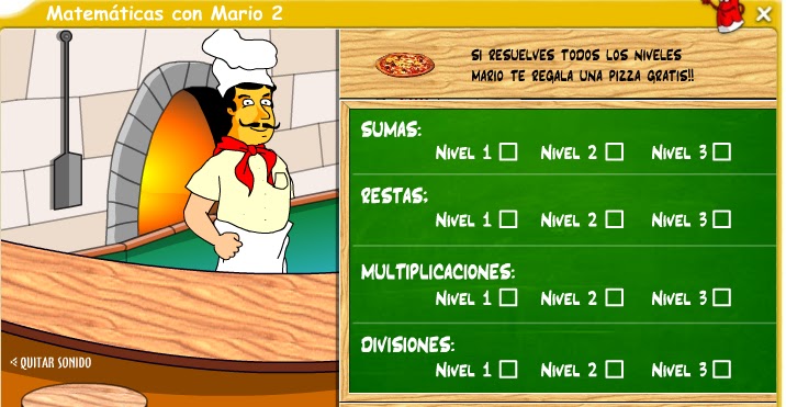 Mario es un pizzero italiano con algún problemilla, en este enlace podemos ayudarle realizando sumas, restas, multiplicaciones y divisiones, las divisiones para los chic@s de 4º son los del segundo nivel, haz clic aquí